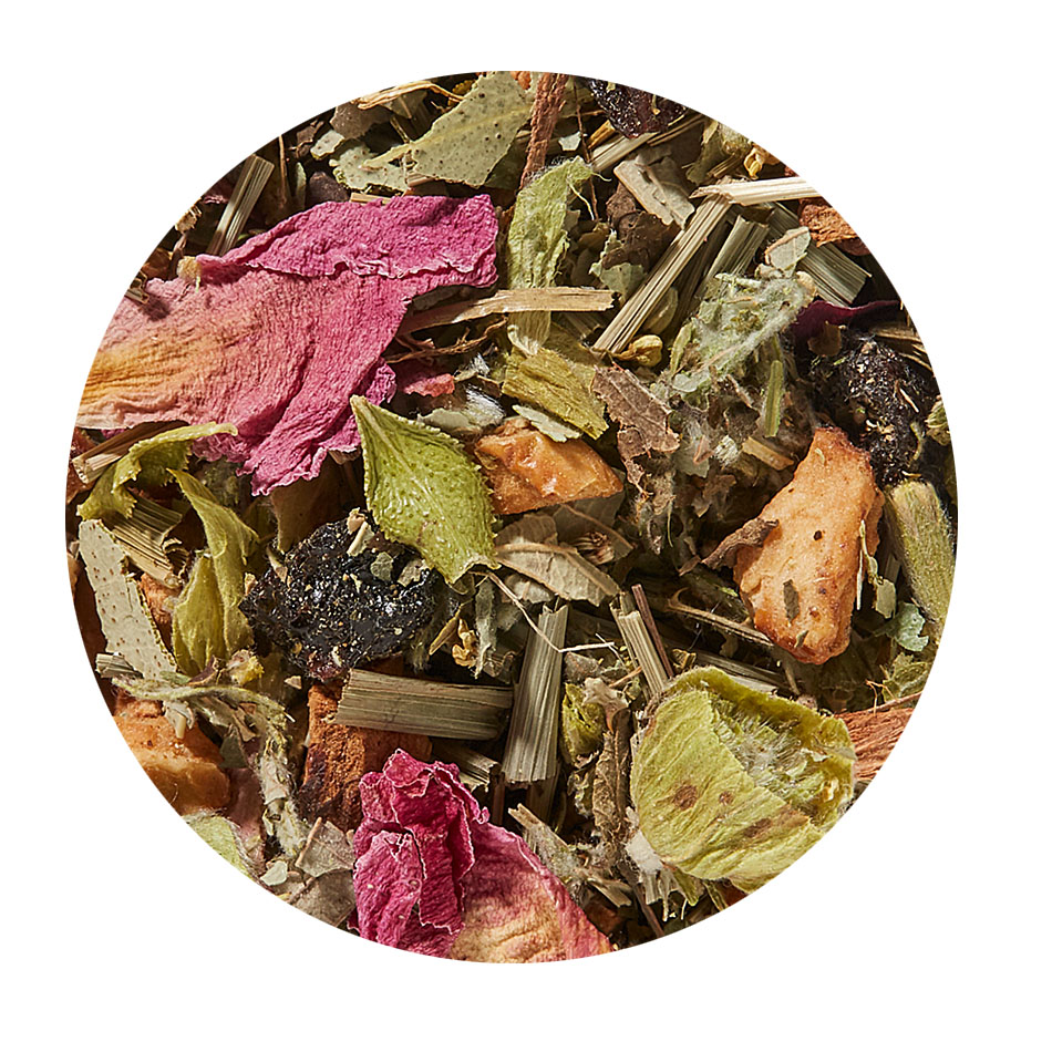 apple pieces, eucalyptus leaves, currants (currants, sunflower oil), lemongrass, blackberry leaves, melissa leaves, Greek mountain tea, natural flavoring, Buchu leaves, sweet blackberry leaves, elderberry blossoms, rose petals.