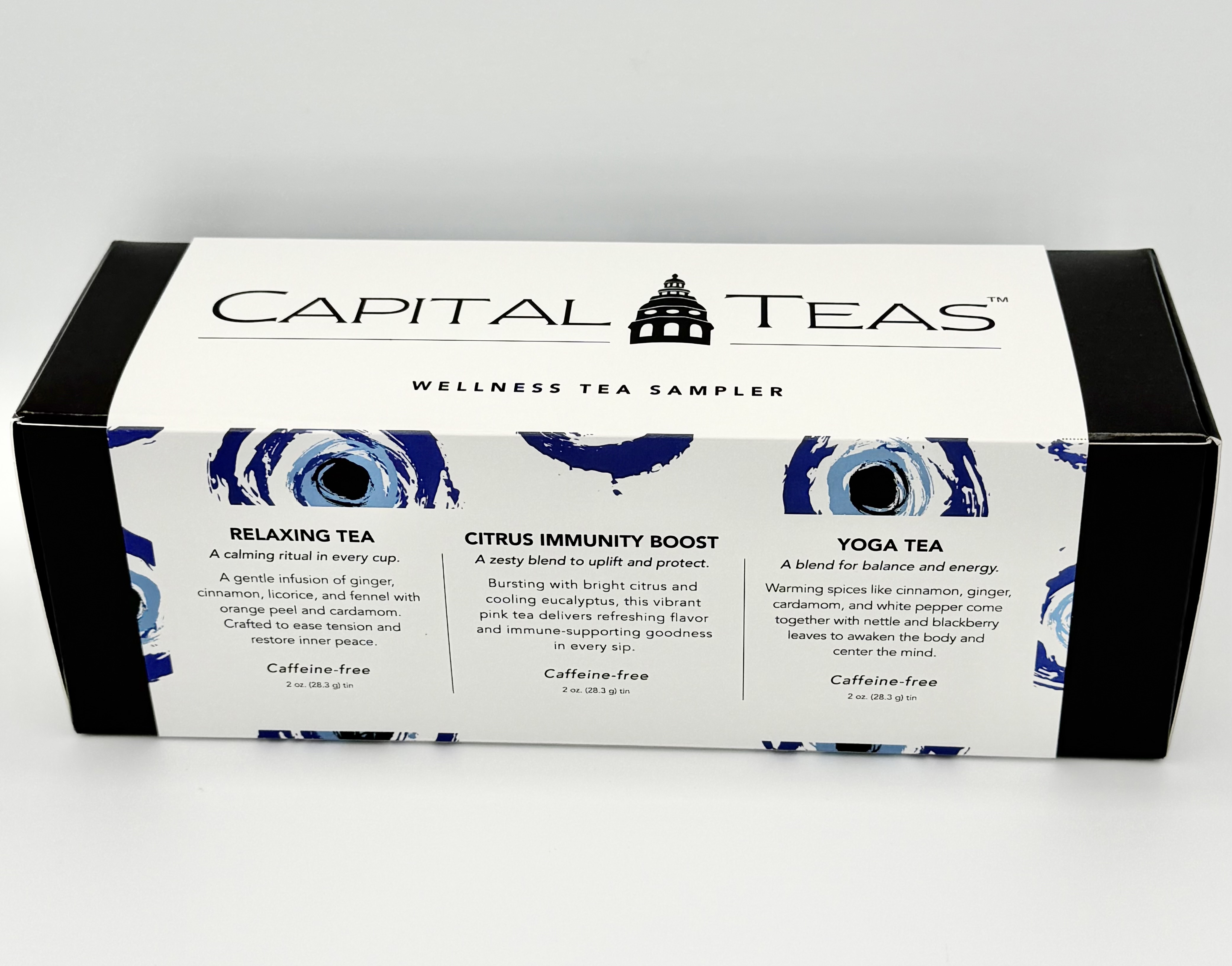 The Wellness Collection sampler is a caffein free set of our favorite herbal teas giving balance from within. Each tea is packaged in a 2oz Capital Teas tin.